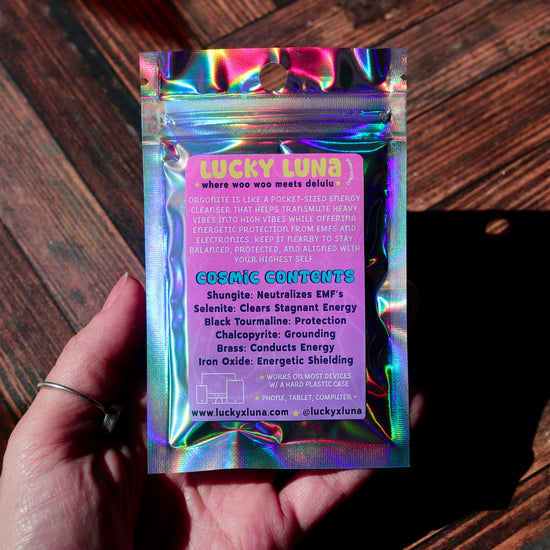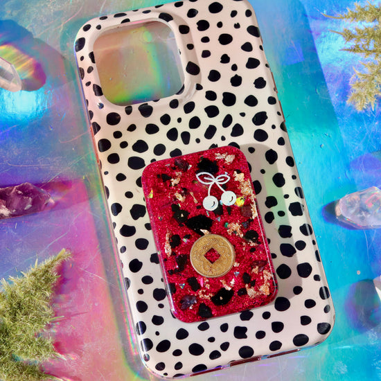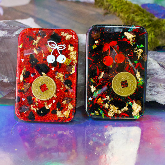 Finished with a holographic cherry motif and a traditional Chinese good luck coin, each piece functions as a mini Orgone Generator for protection, prosperity, clarity, and personal power—wrapped in bold, playful vibrational art.