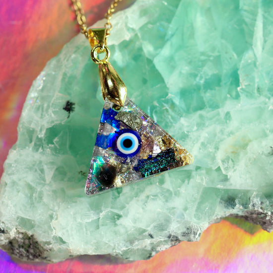 Shield your energy and stay aligned with our handmade Orgonite Evil Eye Necklace. Infused with Black Tourmaline, Amethyst, and protective metals, this pendant blends the ancient symbolism of the Evil Eye with modern Orgonite energy technology. Wear it as your personal amulet for grounding, clarity, and spiritual protection.