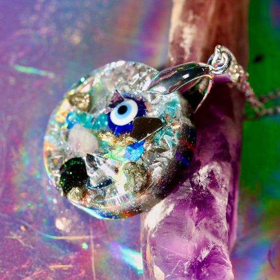 Shield your energy and stay aligned with our handmade Orgonite Evil Eye Necklace. Infused with Black Tourmaline, Amethyst, and protective metals, this pendant blends the ancient symbolism of the Evil Eye with modern Orgonite energy technology. Wear it as your personal amulet for grounding, clarity, and spiritual protection.